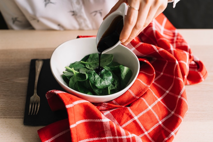 - Добавляем соль, перец по вкусу, масло и винный уксус.