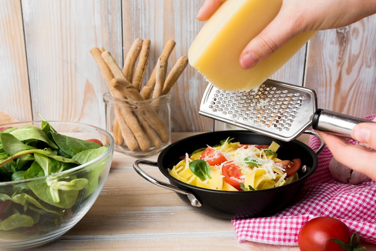 - С помощью мелкой тёрки натираем пармезан или другой сыр твёрдых сортов.