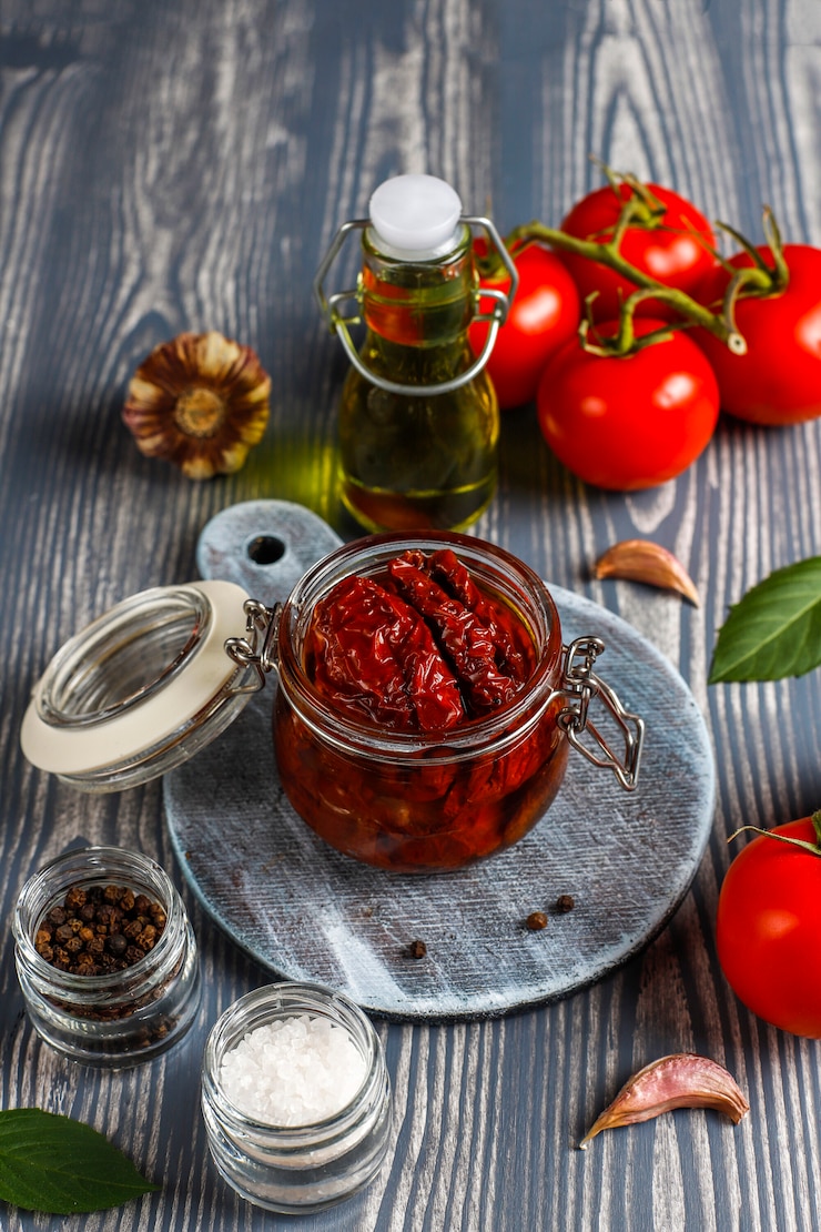 - Нарезанный чеснок и вяленые помидоры укладывают в чистую банку и заливают оливковым маслом.