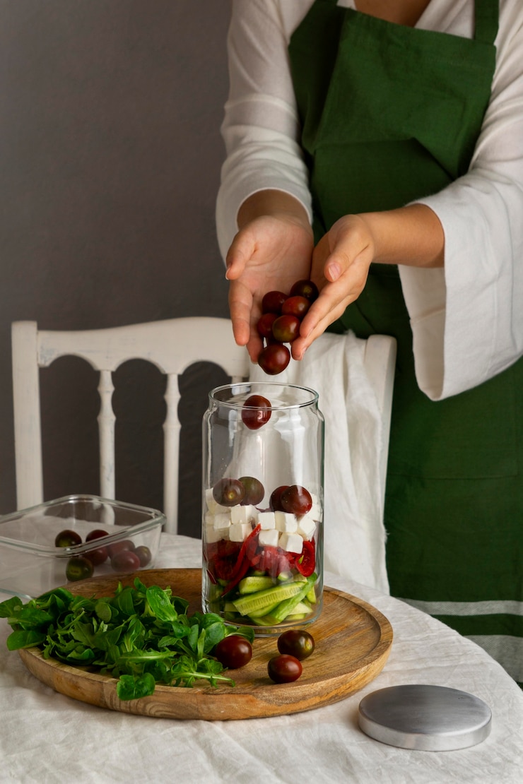 - Вяленые помидоры укладывают, прослойки создавая из томатов и специй.