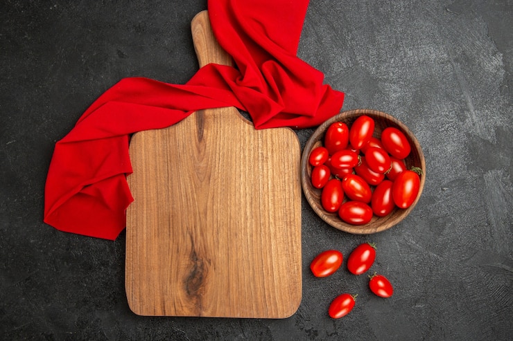 - Тщательно моем помидоры, сушим, разрезаем на две половины и удаляем стебли.