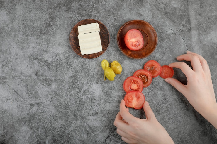 - Твердые помидоры разрезают пополам, а каждую половинку — тонкими дольками.
