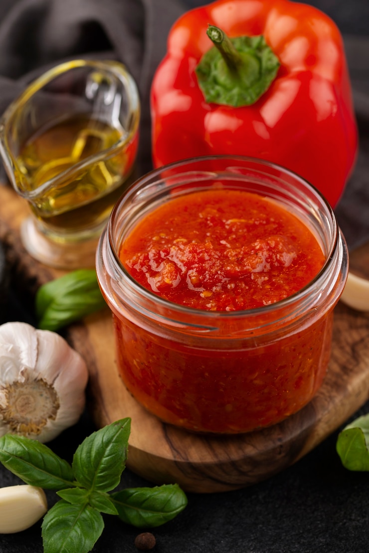 Лечо, приготовленное из болгарского перца и томатной пасты