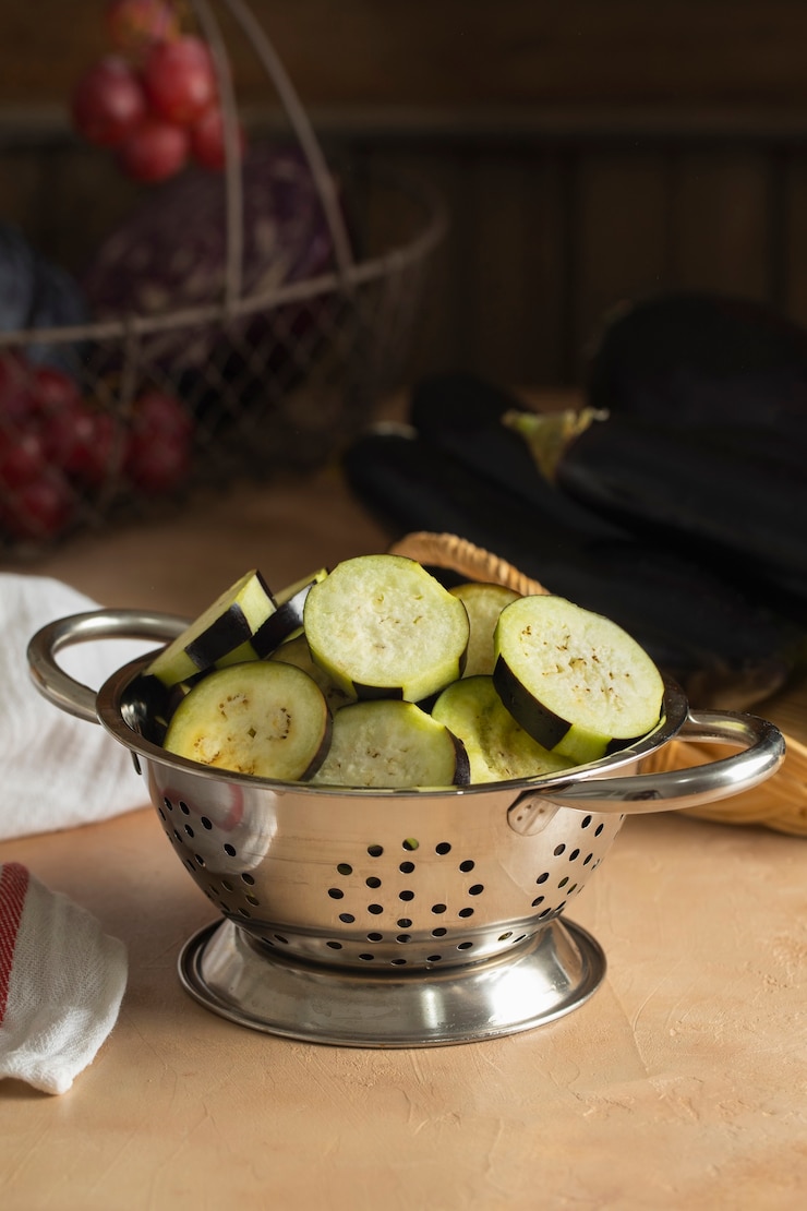 - Чтобы избавиться от лишней жидкости, баклажаны с морковью выкладываем в дуршлаг.