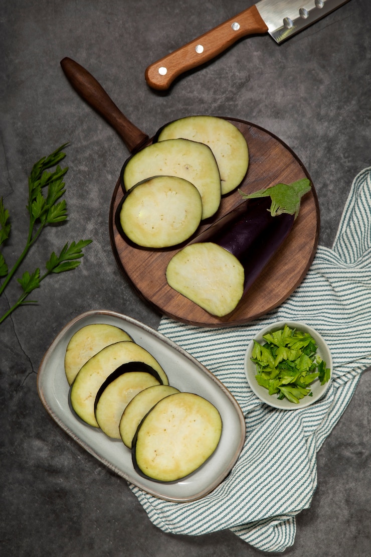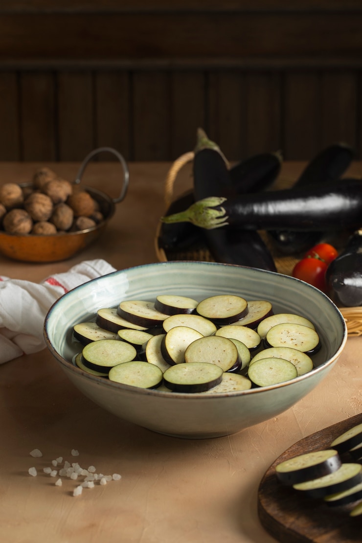 - Баклажаны нарезают на четыре части, после чего — на кусочки. Размер кусочков должен быть средним. Затем их солят, заливают водой, накрывают тарелкой и устанавливают сверху гнет.