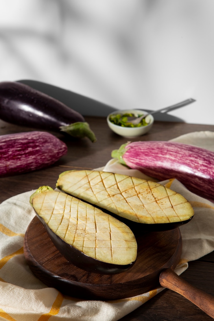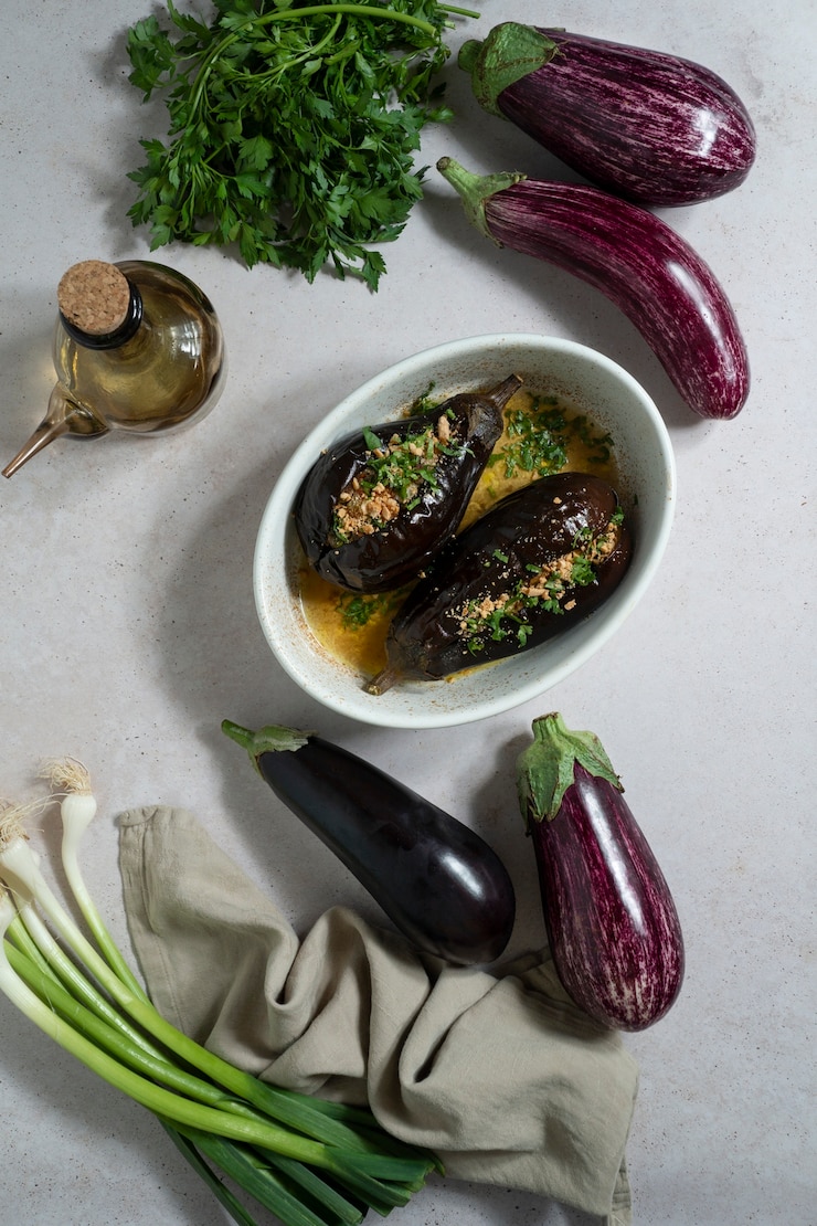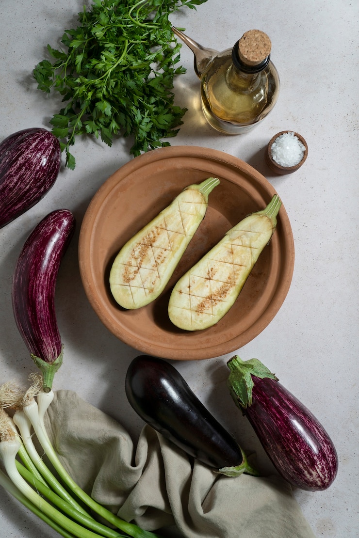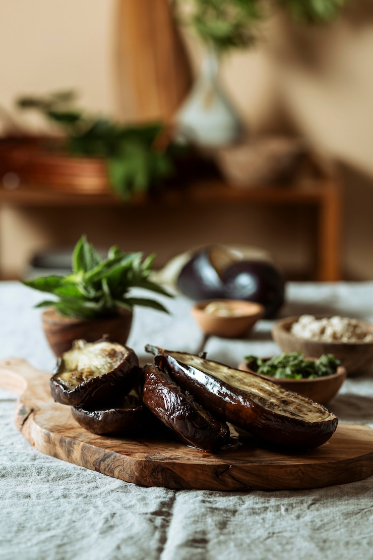 - Остывшие запеченные баклажаны разрезаем пополам и извлекаем мякоть ложкой.