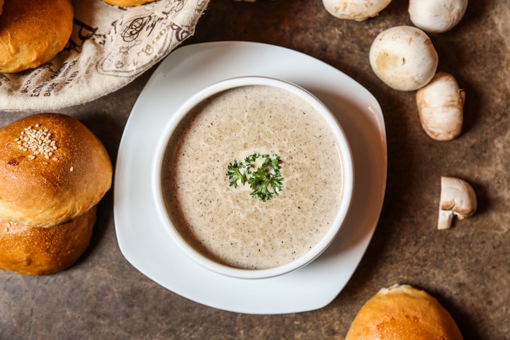 Крем-суп из замороженных грибов, приготовленный на основе куриного бульона