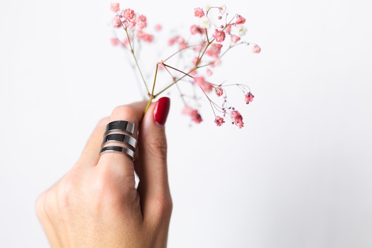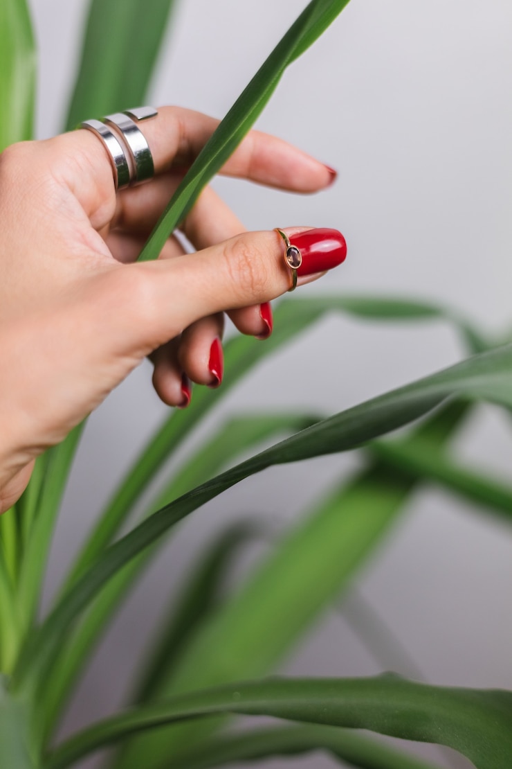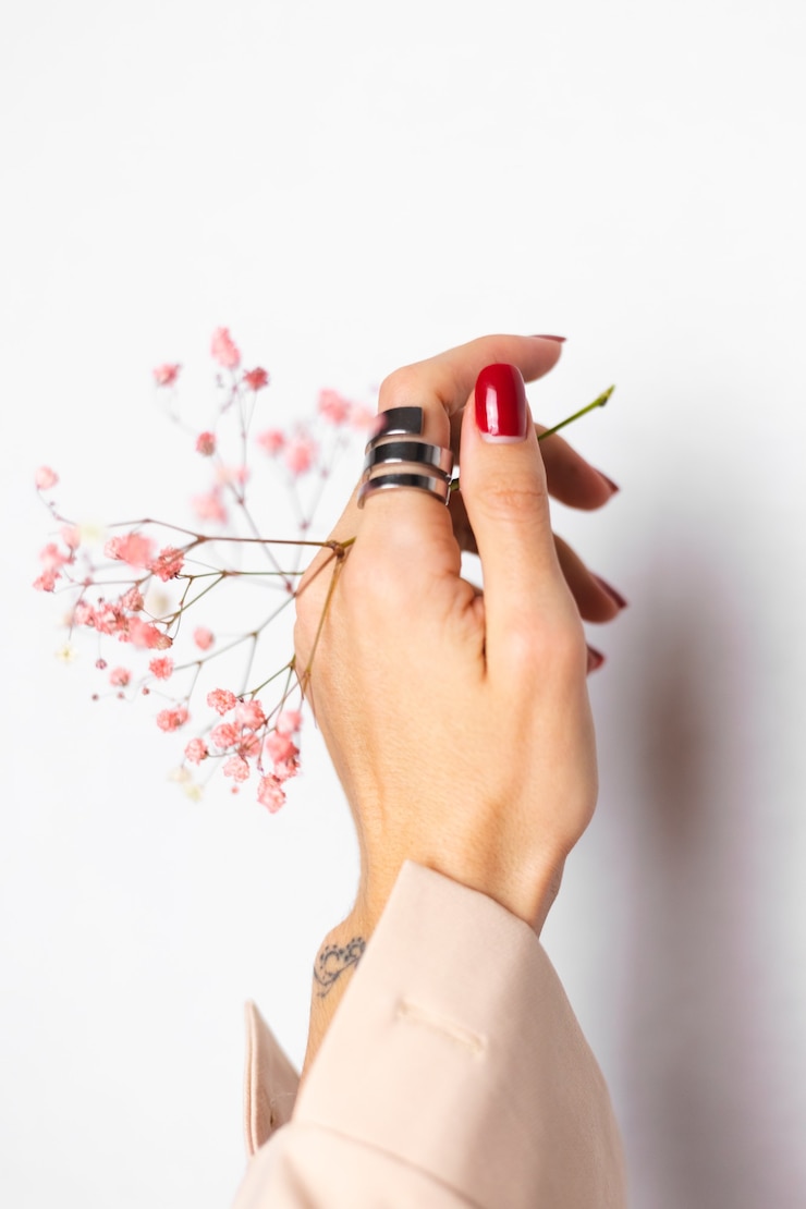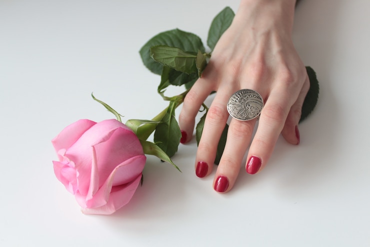 - нежный нюд с белым сердечком на безымянном;