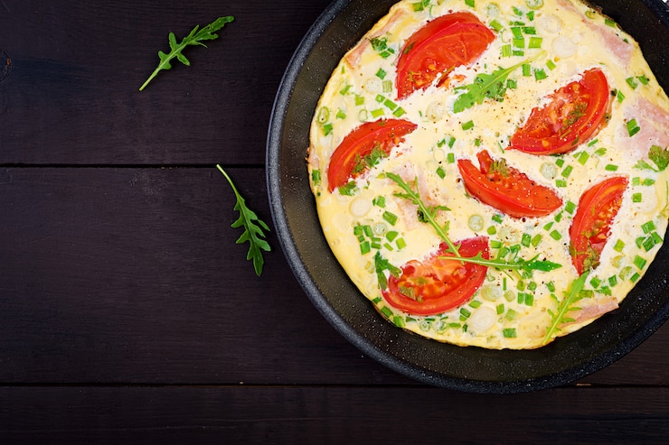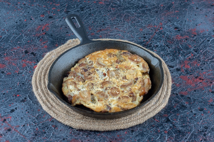 - Начните с разогрева сковороды с маслом, затем вылейте на нее ингредиенты для основы омлета и распределите их равномерным слоем. Обжарьте омлет с одной стороны, переверните и уменьшите температуру.