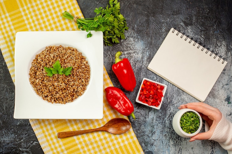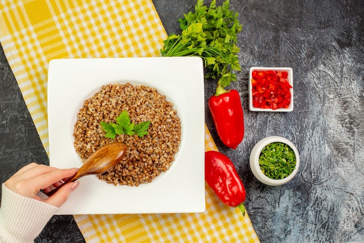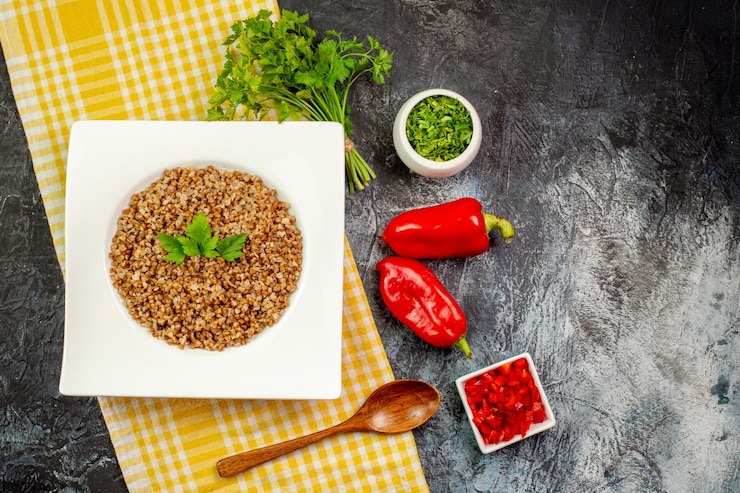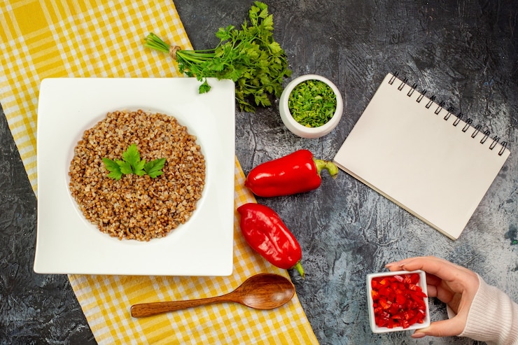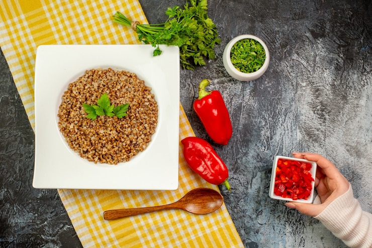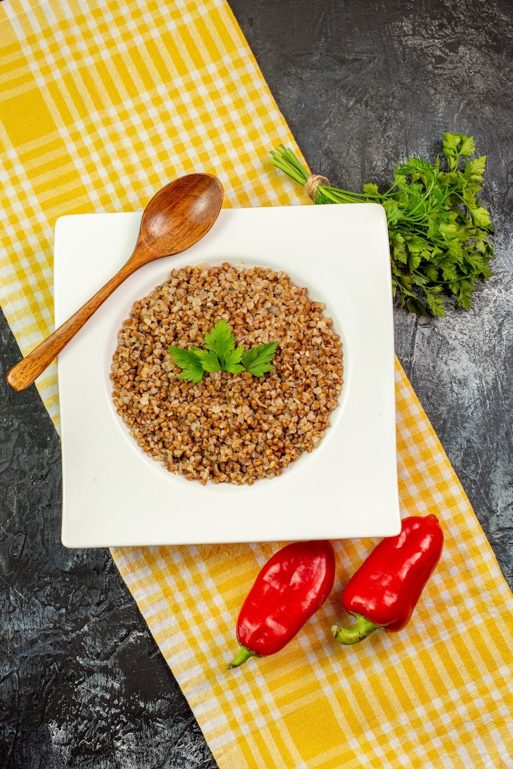- Для придания вкуса гречку с овощами слегка солят и перчат, а сверху выкладывают несколько колец перца чили.
