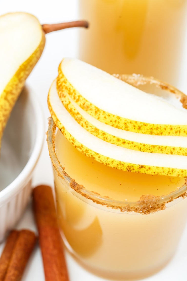 - Режем фрукты тонкими дольками вместе с кожицей, затем помещаем в раствор для сохранения цвета.