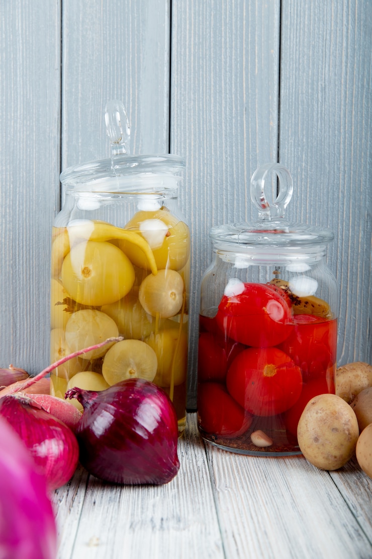 Томаты, перец и лук в стеклянных емкостях объемом один литр.
