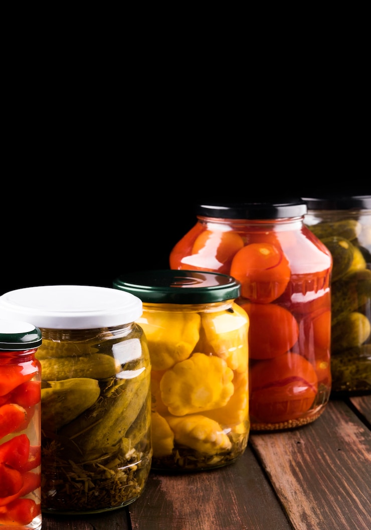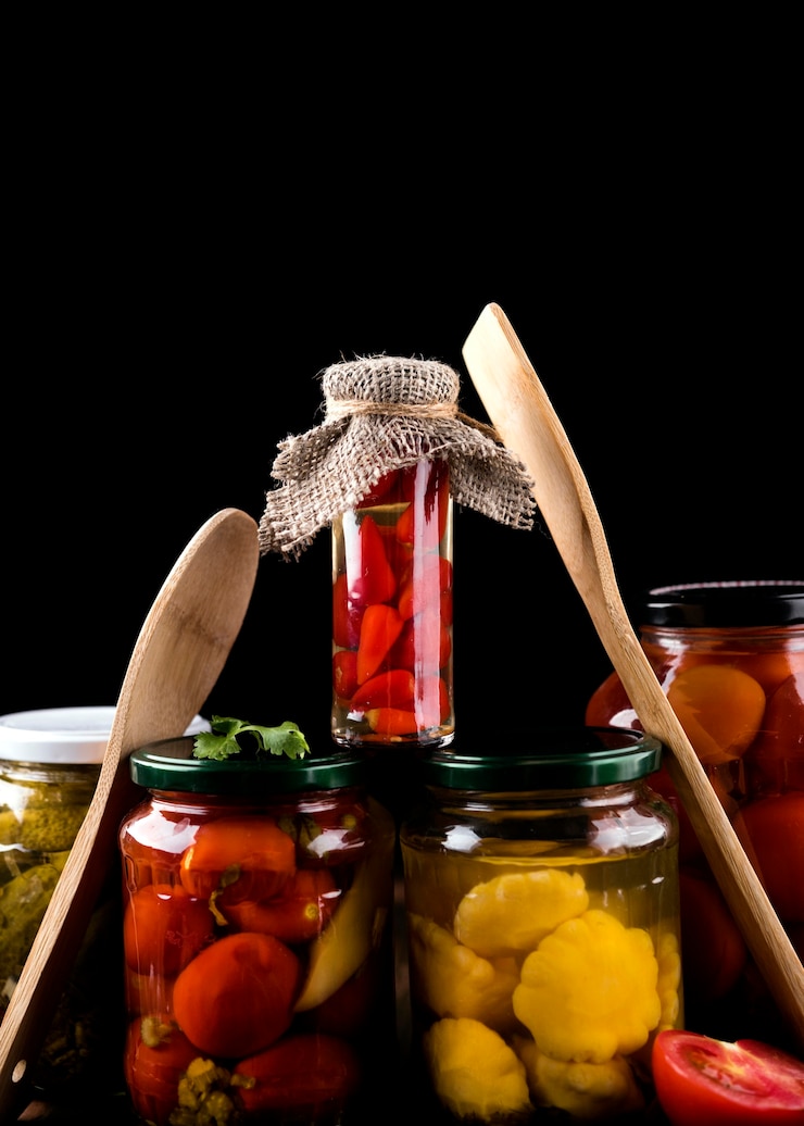 - Готовые овощи помещаем в чистые, предпочтительно стерильные банки, закладывая на дно душистый перец. По желанию для получения более острой закуски добавляем специи по собственному выбору.
