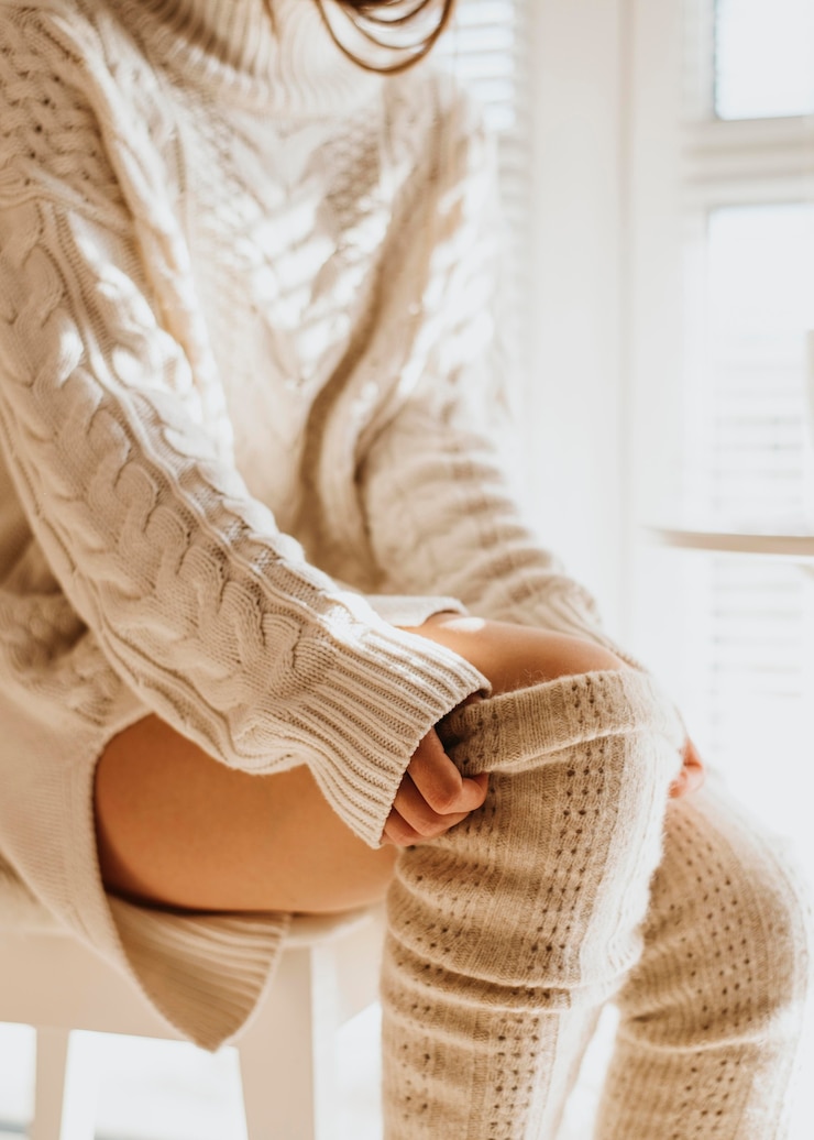 Чтобы создать женственный образ, можно выбрать мини-платье с воротником-хомутом, сапоги-чулки, сочетающиеся по цвету, и кардиган. Завершит образ сумка-тоут.