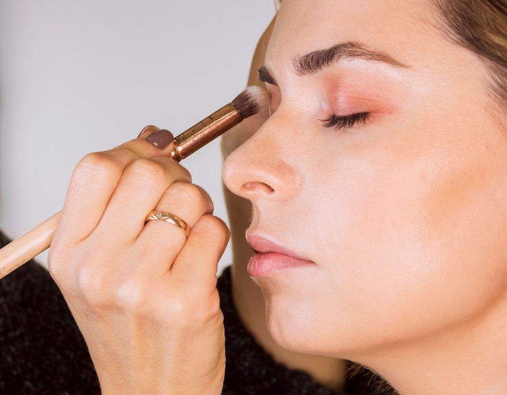 - Для создания ровной поверхности верхнего подвижного века плоской кистью на него наносят тени натуральных оттенков, обычно максимально соответствующих цвету кожи.