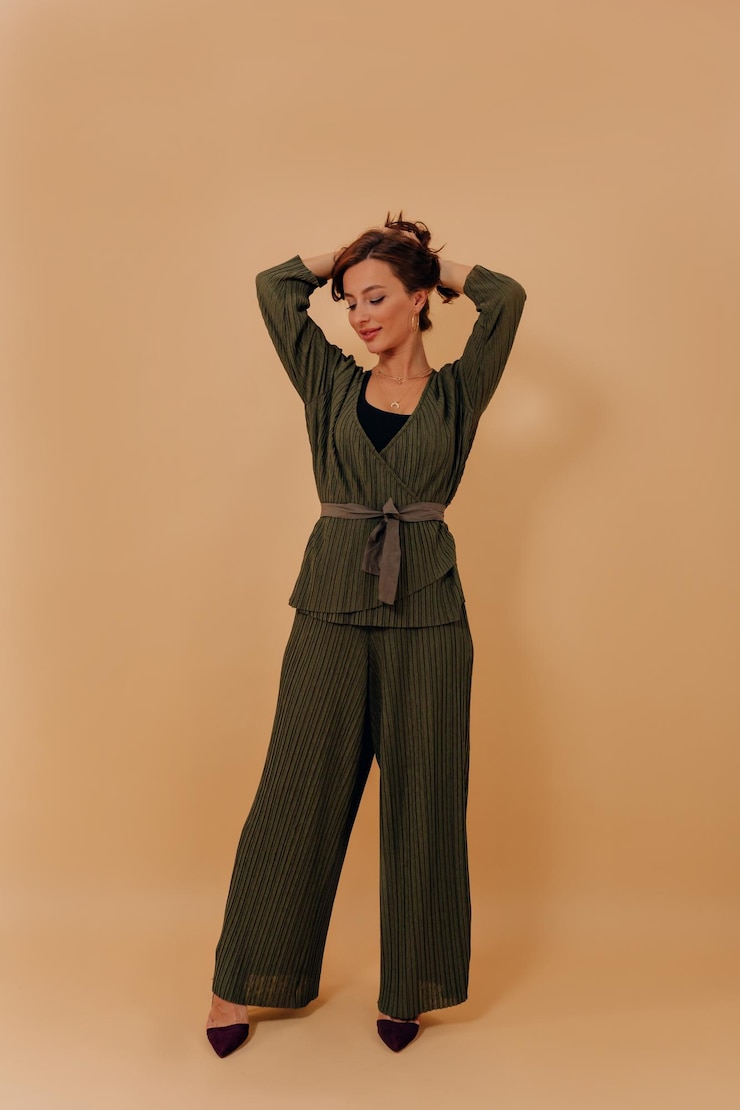 В числе актуальных трендов – вещи с металлическим блеском. Приталенный фасон с «рукавом Джульетты» и укороченными брюками, выполненный из золотистой ткани, привлек внимание на подиуме.