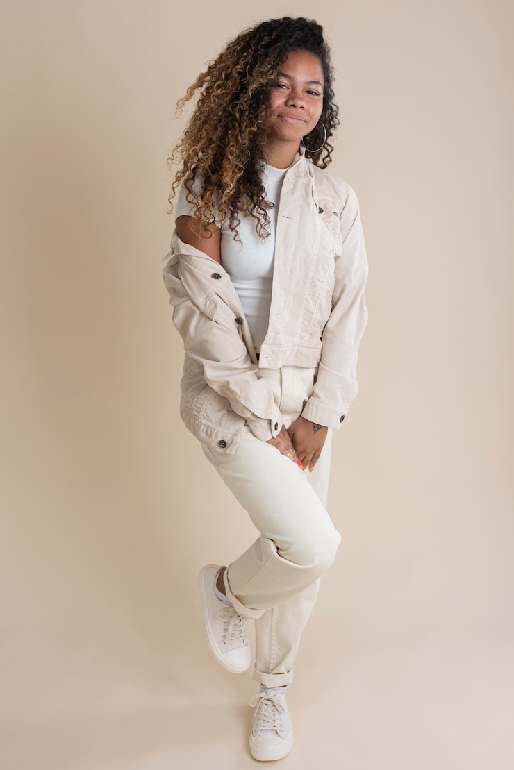 Денимовый комбинезон темного цвета будет гармонично сочетаться с футболкой нежного бежевого цвета и бежевым кардиганом. Завершат этот ансамбль светлые кроссовки.