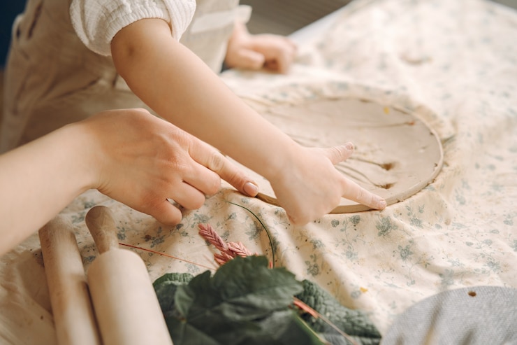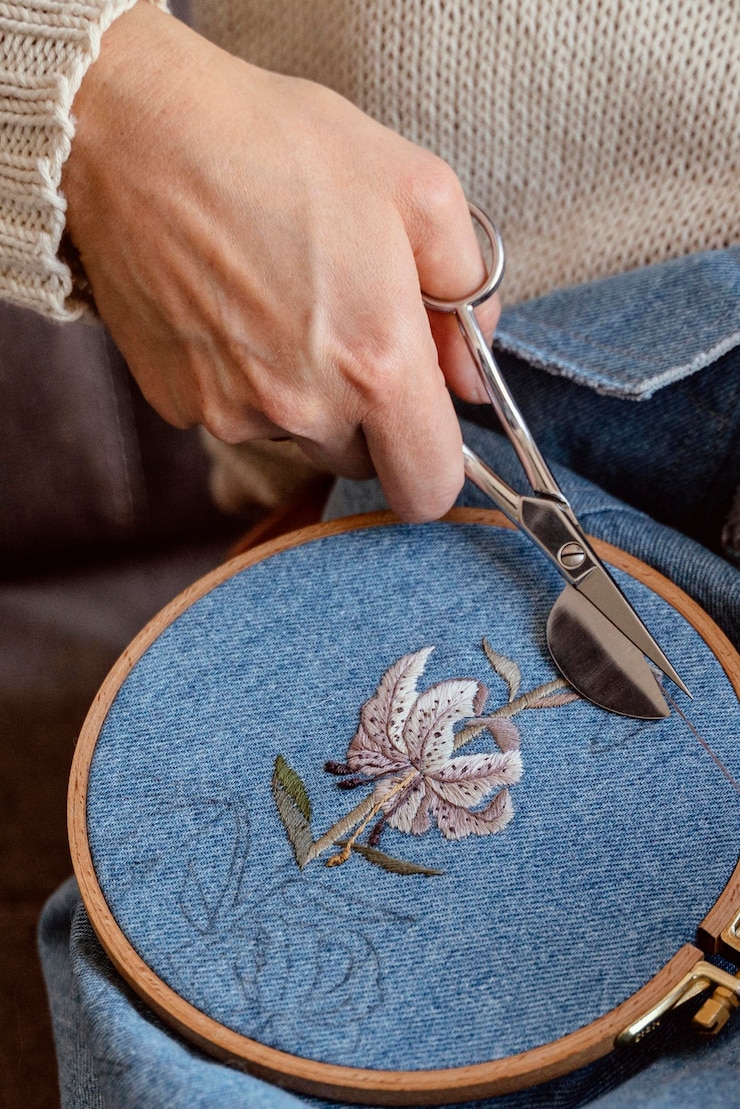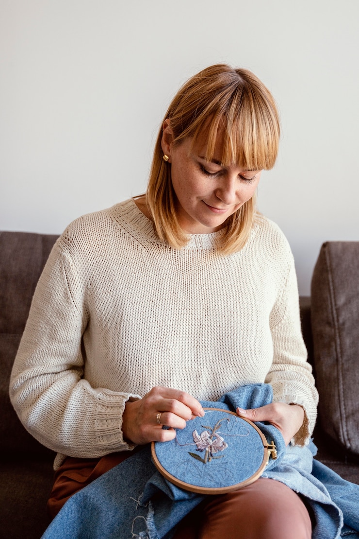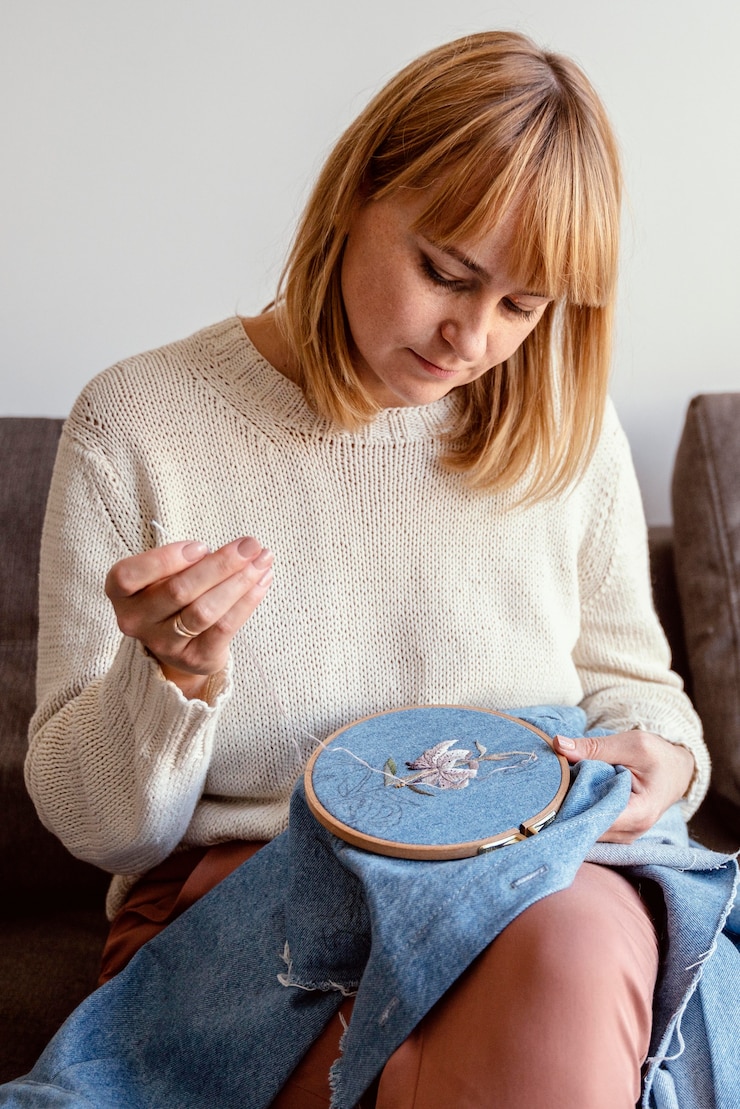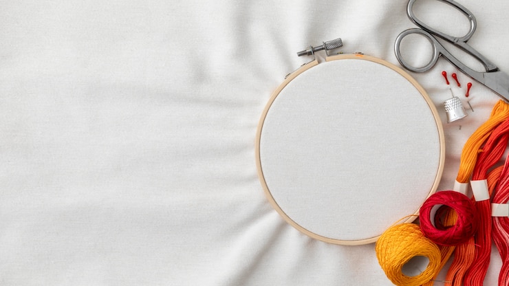 Для вышивания ткань укладывают на маленький обруч, разравнивая её, чтобы нити лежали ровно.