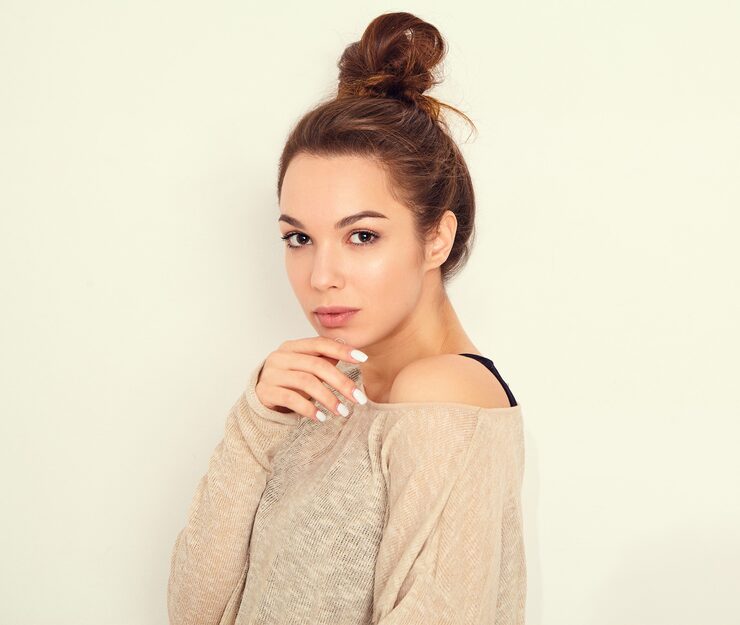 Следующий вариант прически — пучок с помощью узелкового плетения – требует немного больше усилий в исполнении, чем предыдущие, но обладает очень стильным и необычным внешним видом. Он подходит для ношения на работу, поскольку гармонично сочетается с деловым образом, а также может стать интересным дополнением к вечернему наряду для посещения вечеринки или дискотеки.