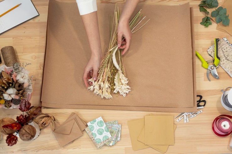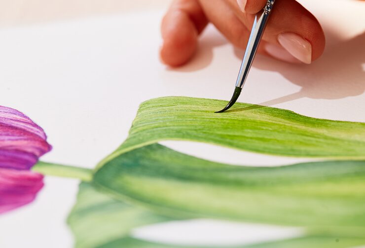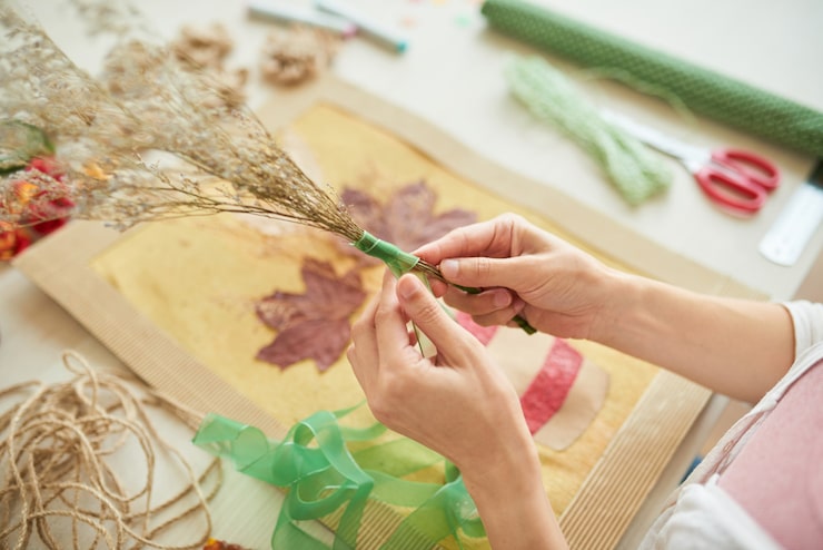 - Чтобы закрепить свежий цветок или листочек, слегка смажьте их клеем с обратной стороны и приклейте к листу цветной бумаги