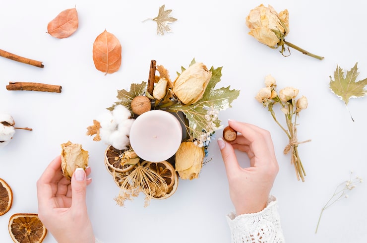 Для декора потребуются шляпки от желудей и сочные, свежие листочки (чтобы они выглядели эффектно, их можно разгладить и высушить с помощью утюга).