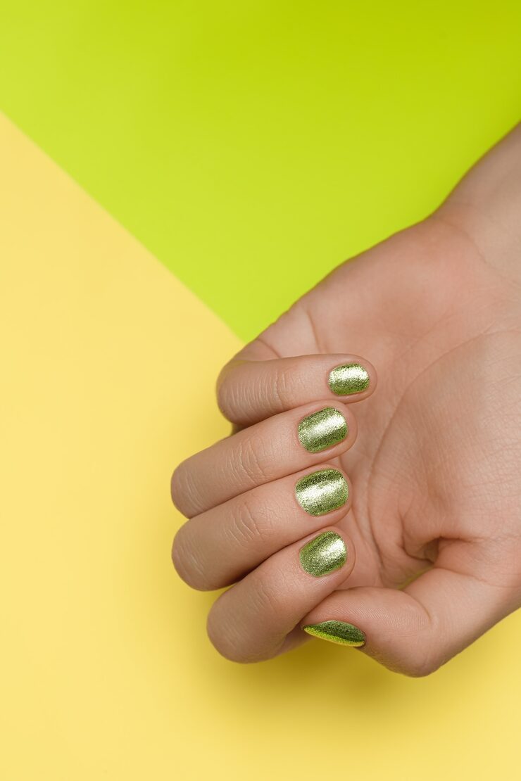 В летнем маникюре 2022 года короткие ногти украшают блестящими элементами в новом ключе. Кусочки фольги небрежно отрывают и наклеивают хаотично, затем затирают, создавая эффект мерцающих космических царапин. Глиттер используется для создания отдельных акцентов, его утапливают в слое полупрозрачного лака, выкладывают в виде чешуек, собирают в композиции, делают небрежную растяжку, напоминающую Млечный путь.