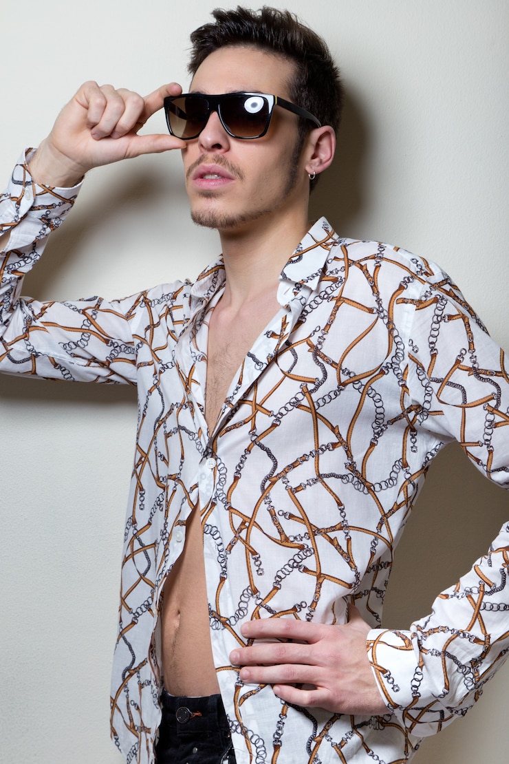 Ключевым элементом стиля является использование разнообразных аксессуаров. Рубашку с цветочным рисунком, заправленную в брюки, удачно дополнят солнцезащитные очки и наручные часы. В качестве обуви предпочтительны сапоги или кроссовки.