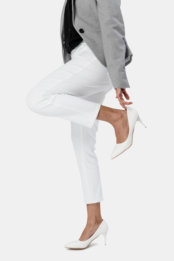 Брюки с высокой талией, будь то прямые или слегка расклешенные модели, в сочетании с обувью на каблуке – беспроигрышный вариант. Скинни также уместны, если они хорошо смотрятся на вас, однако важно при этом сохранять высокую посадку.