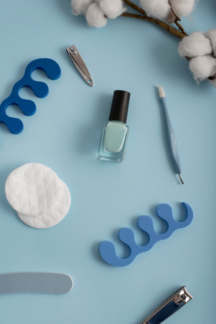 Жемчужный лак, смешанный с голубым и нанесенный на ногти круговыми движениями при помощи доттера, – нежный дизайн, который красиво смотрится даже на коротких ногтях.